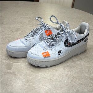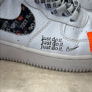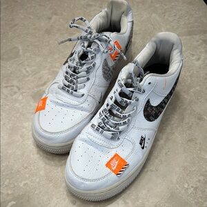 Nike sneakers with white base and orange accents. Unique graphic design. Ideal for casual wear.