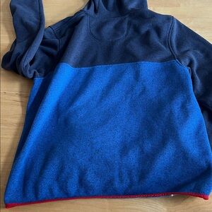 Warm fleece pullover with a hood. Navy top with bright red trim. Ideal for chilly days.