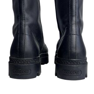 Authentic Coach CitySole Court lace-up boots crafted from smooth black leather with a rugged lug sole for traction and durability. Designed with a combat-inspired silhouette, these boots feature front lacing, side zip entry, pull tabs, and subtle Coach hardware for a clean, utilitarian look.