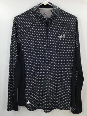 Comfy, breathable pullover top for running, cycling, golf, and other athletics in women's size large (16-18) by Adidas. Features colorblock styling with solid black and black and white panels, long sleeves, mock neck, and easy popover/front quarter-zip closure. Stretchy, extremely lightweight material, with Adidas branding on front and back and Wild Rock Luxury Golf Resort embroidered logo on left breast.