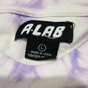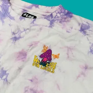Fun and playful A.LAB cropped tank featuring a pastel purple tie-dye wash with a whimsical mushroom + butterfly graphic and the phrase “We Love Our Locals.” A great piece for festival wear, casual summer outfits, or indie / Y2K-inspired styling.