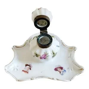 Vtg Hand Painted Porcelain Ink Well and Dish 5" Wide 3 1/2" Tall Floral Design.