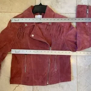 Stylish suede jacket with fringe detail. Mauve hue for a bold look. Ideal for modern fashion.
