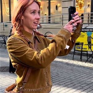 1970’s grommet studded tan suede jacket. Beautiful condition will last forever and only worn twice (in photos shown).