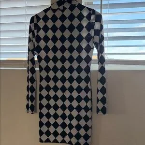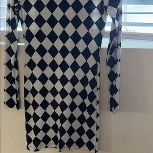 Elegant long sleeve dress with striking black and white diamond design. Ideal for chic outings.