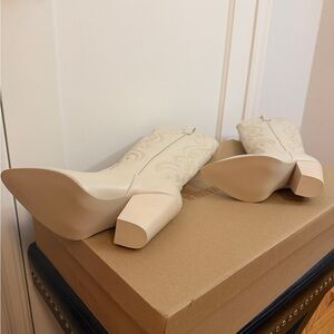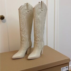 Chic cream boots with intricate stitching. Perfect for elevating any outfit.