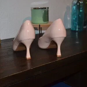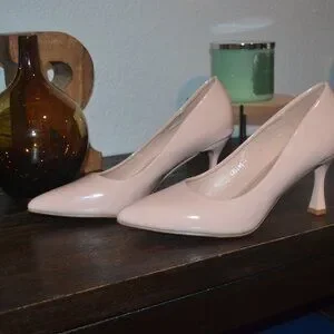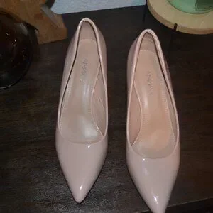 Pre-owned ANNA Pink pointed toe dress pump mid to high covered heel, size 10. Leather upper with glosyy finish. Non slip outsole.