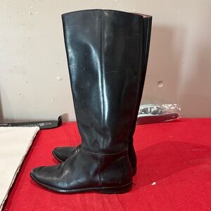 Sleek black leather combat boots. Knee-high design. Durable and stylish.