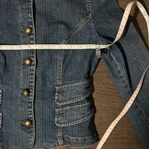 VTG Women's fitted denim majorette-style jacket in dark wash with brass buttons