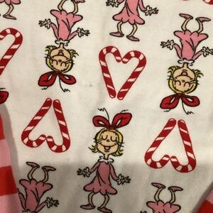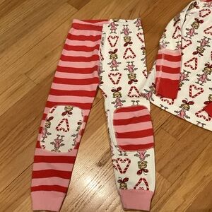Adorable pajama set with heart and bear print. Red and pink stripes on pants. Soft and comfortable fabric.