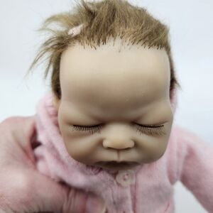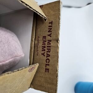 Tiny Miracle Emmy Doll, By Ashton-Drake Galleries. Adorable baby doll dressed in a soft pink sweater. She is 22 years old. my daughter was a premmie and her name is the same. She did play with it. It has a few stains on it and the sweater has some pillowing. It is a tiny doll. Please look at measurements, and the pictures do include the stains and sweater pillowing. I still have the box.