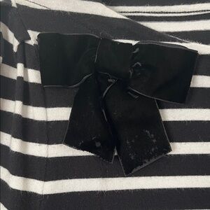 Chic black and white striped blouse. Features embroidered cherry detail. Elegant bow on shoulder. Perfect for casual or dressy occasions.