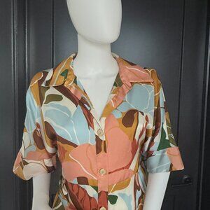 Stunning abstract floral midi dress featuring warm earth tones and soft pastels. Designed with a button-front closure, short sleeves, and a matching statement belt with a modern buckle that defines the waist beautifully. Flowy, lightweight fabric gives this piece an elevated, artistic feel.