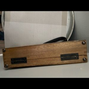 Charming vintage wooden handbag featuring a delightful floral design. Perfect for adding a unique touch to any outfit. The natural wood and black handle create a classic look.