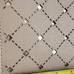 Michael Kors | wristlet with diamond pattern. Blush pink hue. Perfect for essentials. Markings on plated logos, some discoloring around plated zipper and logo, and little diamonds on front show wear (all of these are pictured).