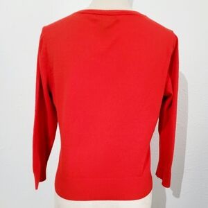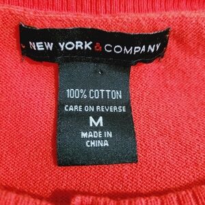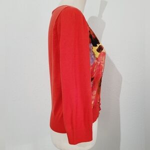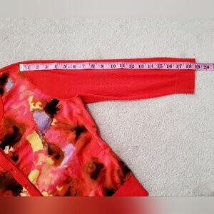 Add a bold pop of color to your wardrobe with this New York & Company women’s cardigan in size Medium. This vibrant sweater features a bright red knit body with a striking abstract floral print panel on the front in shades of yellow, purple, pink, and brown.
