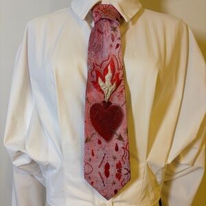 Elevate your accessory game with this striking Sacred Heart & Eternal Flame graphic tie. Featuring a unique, artistic design with a bold flaming heart and arrow motifs, this piece is perfect for those who love gothic, avant-garde, or symbolic fashion.