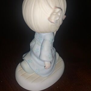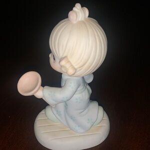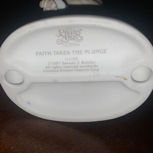 1987 PRECIOUS MOMENTS FAITH TAKES THE PLUNGE FIGURINE. MADE OF FINE PORCELAIN Charming figurine in a light blue dress. Holds a plunger . Features a cream base.