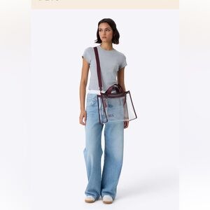 Fully transparent material bag features a chic burgundy trim. Perfect for any occasion.