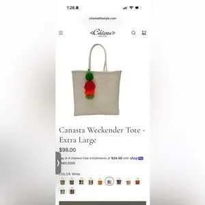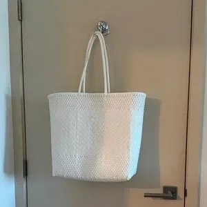 Stylish white woven tote bag featuring vibrant tassels. Perfect for any occasion.