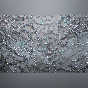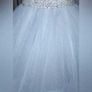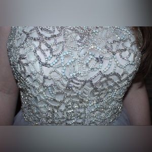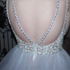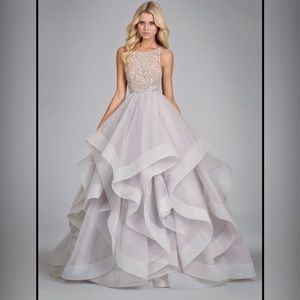 Breast pads added & minor alterations done in the front to make it more flowy. Does have minor flaws. One is a tear on the bottom right side,hard to find with all the layers. Has mini holes from getting caught on jewels, won't notice unless looking for them. Any used Dori dress will have those mini holes, the jewels just get caught on it. Sold AS IS. This is such a great price for the opportunity to wear a Hayley Paige. Dry cleaned & ready to wear!