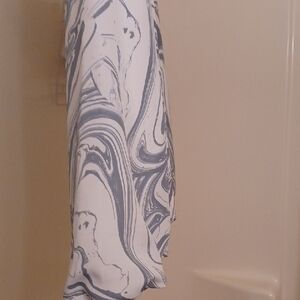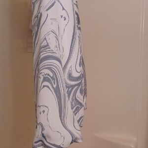 Stylish blouse featuring a grayish blue and white pattern. Perfect for modern elegance. The sleeve balloon at the bottom. Has tie back with slits on both sides coming down in front.
