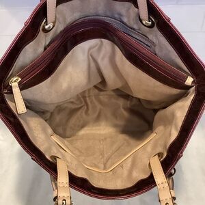 Authentic designer Michael Kors Embossed Merlot Signature Patent Leather EW Jet Set Tote. MK tote bag in a striking burgundy, merlot color is crafted with a glossy patent leather finish, exuding elegance and sophistication. The bag features a classic tote silhouette, complemented by a signature gold-tone MK charm, making it a standout accessory for any occasion. Its spacious tan, logo, three compartment interior ensures practicality without compromising on style. Gold hardware accents compliment the deep red color and tan leather straps. Photos are part of the description. Please ask questions and make an offer!!