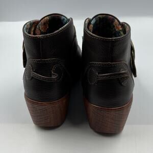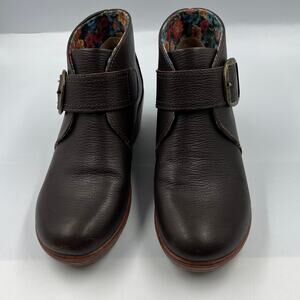 Alegria slip on boots in espresso color, Symone style SYM-8104, velcro attached buckle, short heel, round toe, leather body. Women's size UK 38, US 8. Shoes have some scuff marks on the toe and heel as pictured otherwise they are in great condition.