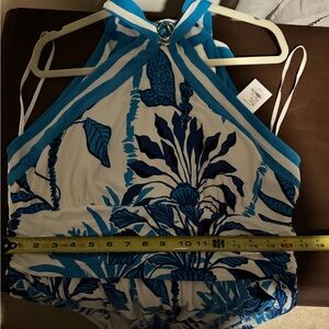 NWT. Fit-and-flare maxi dress with a halter neckline, gold hardware, and interior bodice cups. This style also features a ruched waistband and functional back neck tie.