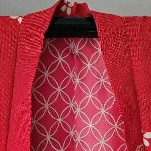 Features the traditional hanging sleeve of a kimono. Measures 50" from sleeve tip to tip. Length is 28" from back of neck and 30" including collar. Chest area is 46". Haori jackets do not wrap; are worn open. Hip area across the back is 24". Close to fitting a size 8-10.