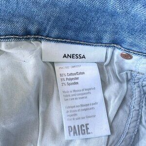 Paige Anessa wide-leg ankle jeans in helena light blue stretch denim (93% cotton, 5% polyester, 2% spandex) with high-rise cropped fit in size 27. (waist: 13.5 in, inseam: 26.5 in)