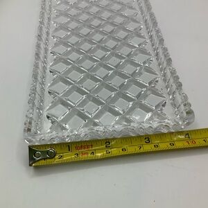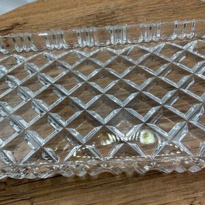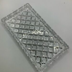 Beautiful clear glass tray with intricate patterns. Perfect for serving or decoration.