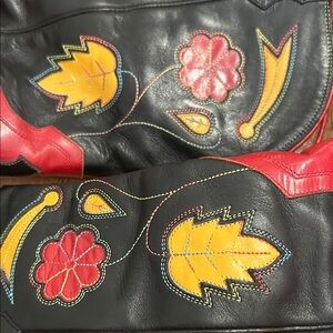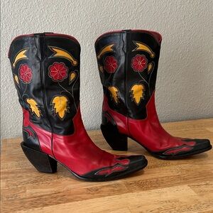Stylish red and black and yellow color block western boots with vibrant floral accents. Perfect for adding a bold touch to any outfit. Beautiful colorful stitching