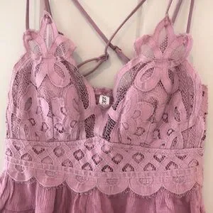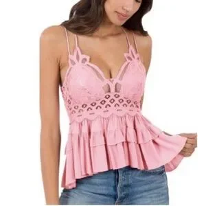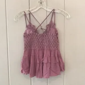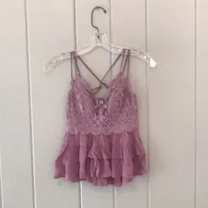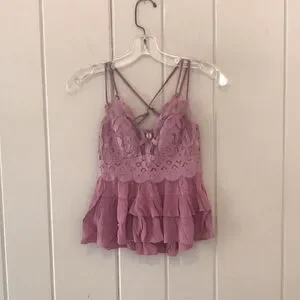 Lace peplum top from Zenana. Criss cross adjustable straps. Ruffle peplum style with lace detail. Light removable pads in bra for extra support and coverage. Color is a dusty rose, not as pink as the stock photo. PLEASE READ: Size says medium but fits more like an extra small. PLEASE REFER TO MEASUREMENTS.
