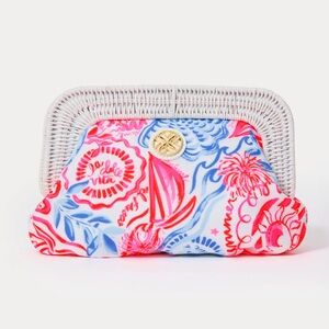 New with tags Lilly Pulitzer Cayo Coco woven clutch in a colorful design. Features a vibrant mix of pink, blue, and white. Perfect for any occasion.