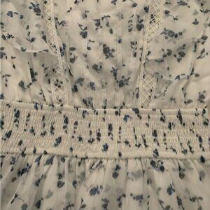 By Nicola White Blue Floral Mini Dress Size Small. Excellent preowned condition. Long sleeve, square neckline, flirty, feminine and tiered. Smocked waist line.