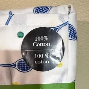 King sheet set featuring a tennis print. Blue and yellow accents on a white background. Made from 100% cotton.