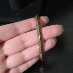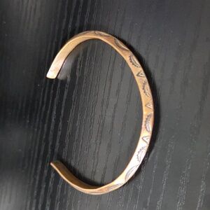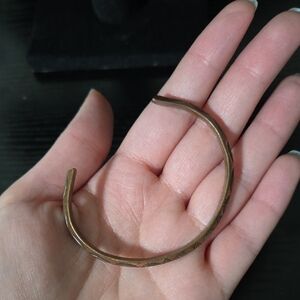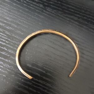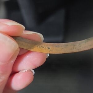 Inside the cuff there is a stamped copper mark along with a maker’s mark that is present but not clearly legible. No attribution is made beyond what is visibly stamped. Material is described by appearance only and has not been metal tested.