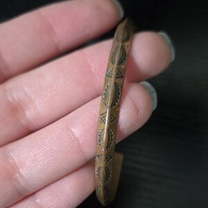 Vintage copper cuff bracelet featuring etched geometric style motifs throughout the band. Open cuff design allows for easy slip-on wear and slight adjustability. The bracelet shows classic southwestern and Native American style influence with carved decorative detailing that gives it a bold, wearable statement look.