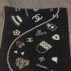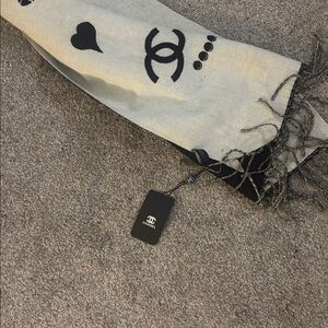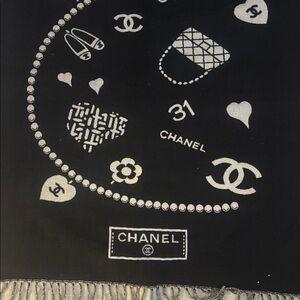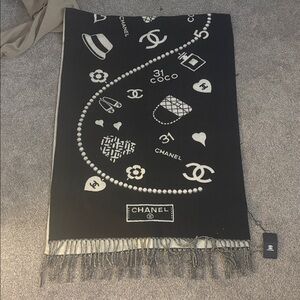 Brand new w tags CHANEL SCARF. I was debating on selling this one because the pattern is so cute and girly it has the CC logo all over it with a hat the number five a flower a perfume bottle a bag another heart it’s so girly and cute, but I’m going to sell it. I’m not gonna take any low ball offers tho. This scarf is half cashmere so it’s very soft and luxurious.
