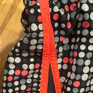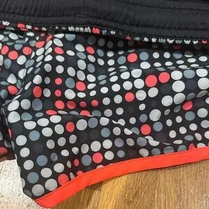 Dynamic design with black and deep neon pink polka dots. Perfect for workouts. Comfortable fit. Small pocket inside. Draw strings waist.