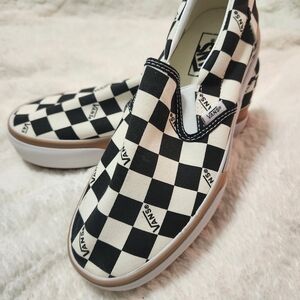 Classic Vans slip-on shoes with a black and white checkerboard pattern. Features the iconic Vans logo. Brand new. Never worn. Too big for me.