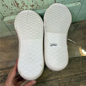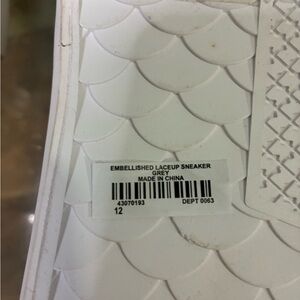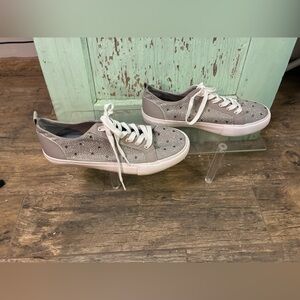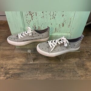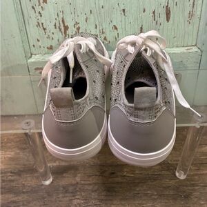 Stylish gray athletic shoes. Features white laces. Perfect for casual wear.