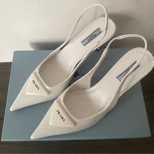 Chic Prada slingback heels in a refined white shade. Ideal for stylish outings.