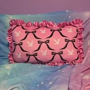 Add a touch of elegance to your bedroom with this pink decorative pillow featuring a stylish black bow design with the playboy bunny head. Perfect for enhancing your bedding ensemble.