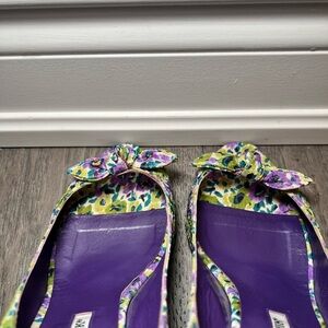 Amazing floral heels with a vibrant purple and green design. Perfect for a stylish statement.