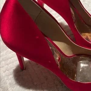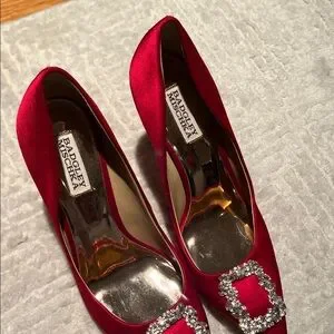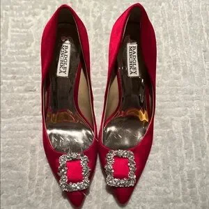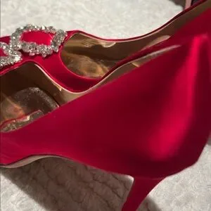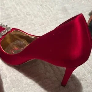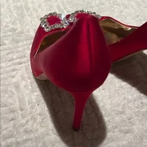 Badgley Mischka Red Satin Heels with Crystal Buckle