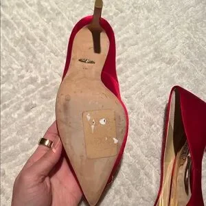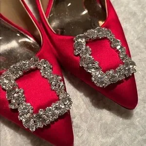 Chic red satin heels with dazzling crystal buckle. Ideal for elegant events. Worn once.
