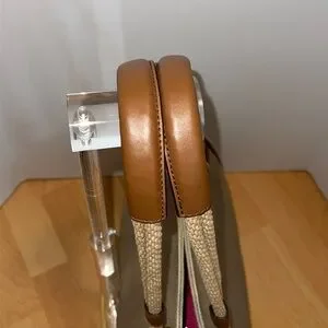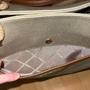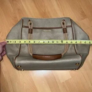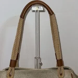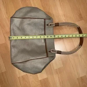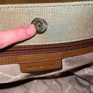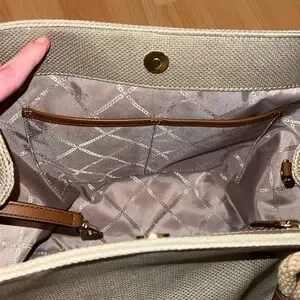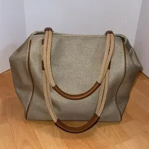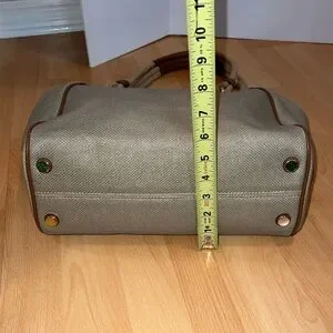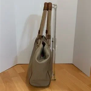 Pale gold/beige cotton canvas grab bag tote with tan faux leather accents. Has gold tone hardware, gold tone metal feet on bottom of bag, outer slip pocket with magnetic button closure. Inside of bag is clean & spotless. It has a magnetic button closure, one zippered pocket & two smaller slip pockets.