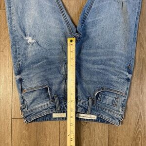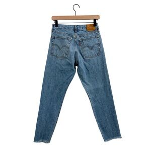 Levi's straight leg jeans in classic blue. Features a modern distressed style. Ideal for everyday wear.
